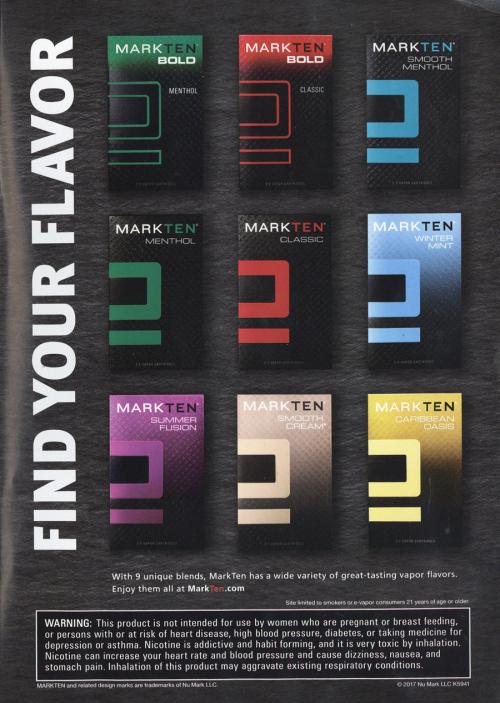 MarkTen magazine ad that shows a lineup of their cartridge flavors with the text "Find your flavor." Directs the viewer to the brand website to learn more.