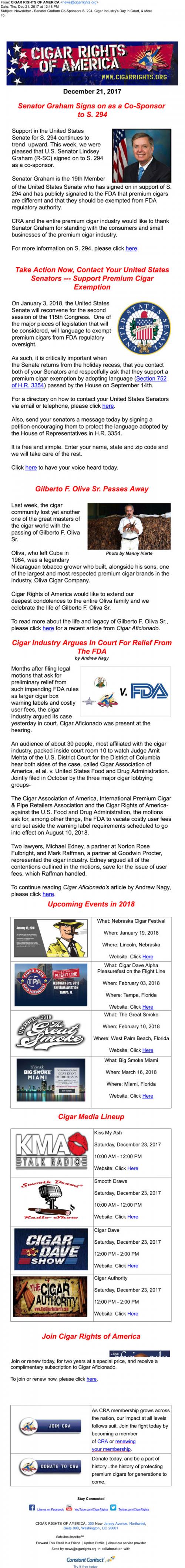 Email from the Cigar Rights of America in December 2017 with updates from current legislation regarding FDA exemptions and legal action regarding premium cigars. Also links to upcoming cigar-themed events and media, and solicits for donations and memberships.