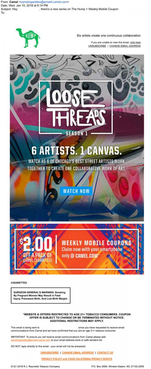 Camel email from January 2018 linking to a Hump feature about a collaborative art series called Loose Threads. The video can be watched on the brand website. Also links to claim weekly mobile coupons.