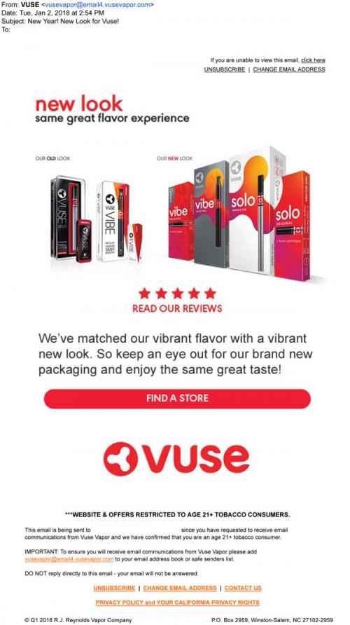 Email from Vuse in January 2018 announcing their "vibrant new look" of packaging set to be in stores soon. Links to the brand website to find a nearby retail location.