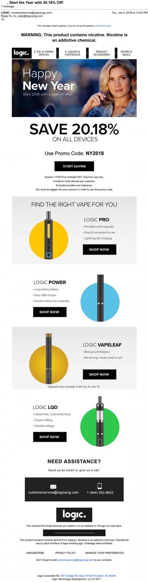 Email from Logic in January 2018 announcing a special New Year sale on devices; includes a promo code to use on the brand website and a preview of different devices they offer.