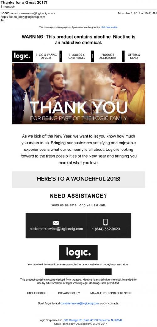 Logic email from January 2018 thanking the recipient for being a customer in 2017 and "being part of the Logic family."