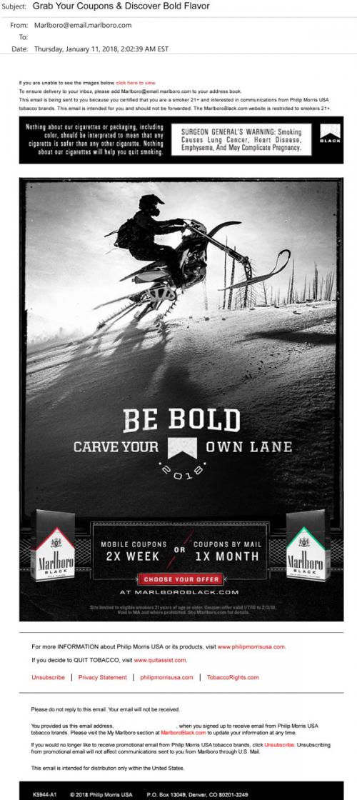 Marlboro Black email from January 2018 promoting two ways to receive coupons, whether by direct mail or mobile phone, with a link to the brand website to claim them.