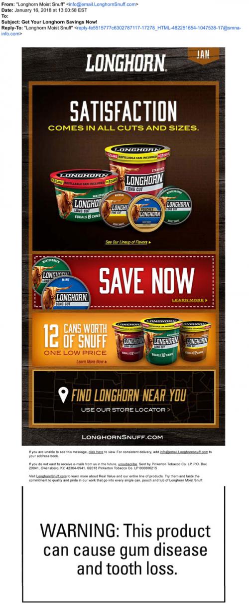 Email from Longhorn in January 2018 linking to claim coupons on the brand website, showing various cans and tub products they offer.
