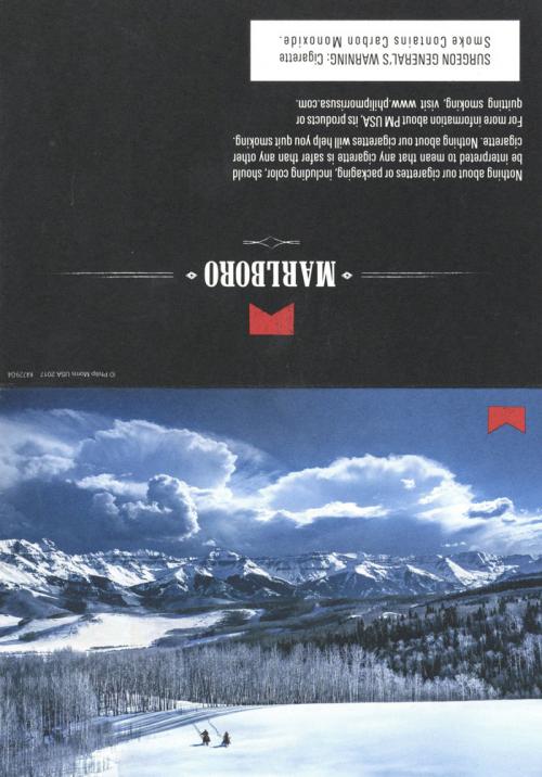 A card wishing the recipient "Seasons Greetings" received from Marlboro in January 2018. Shows two cowboys on horseback with a stunning snowy vista behind them. Includes coupons.