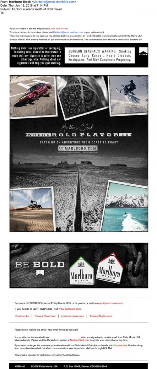 Marlboro Black email from January 2018 inviting the recipient to "catch up on adventure from coast to coast" by checking out what was featured on the brand website over the past year.