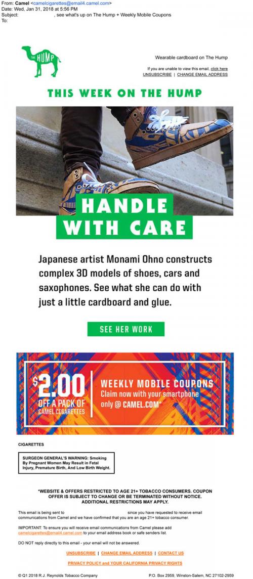 Email from Camel in January 2018 promoting the weekly Hump article and the available mobile coupons.