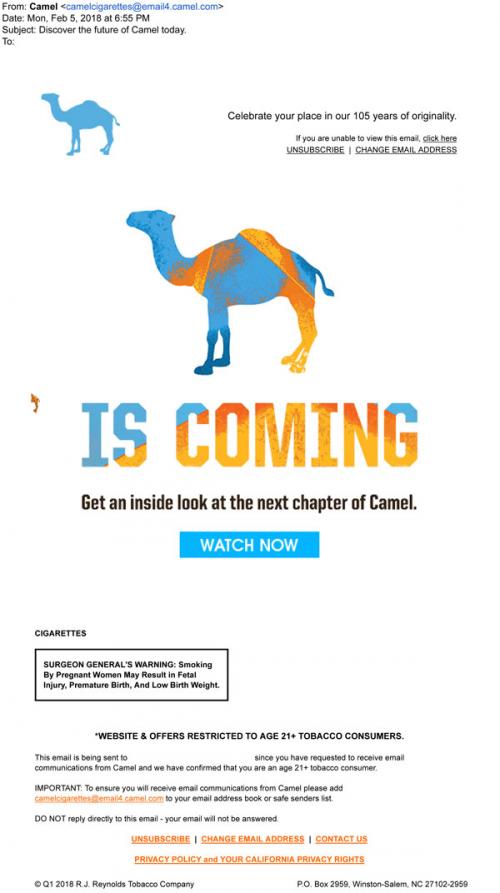 Email from Camel in February 2018 announcing new changes coming to the brand website. Links to watch a video and get an inside look.