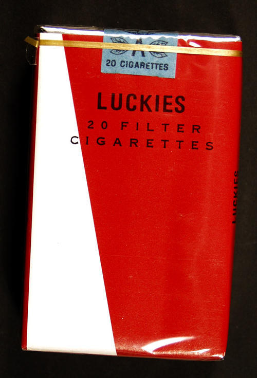 Luckies filter cigarettes - red pack with white vertical stripe. The American Tobacco Company.