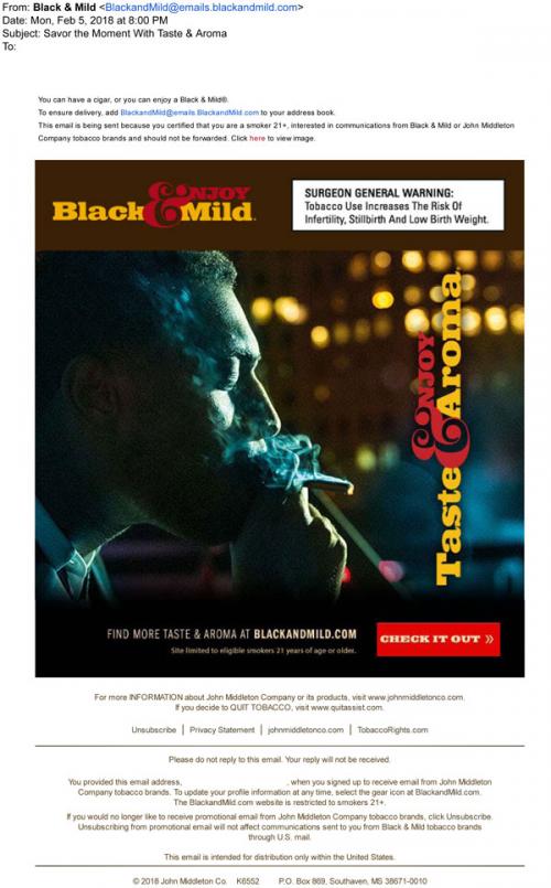 Email from Black & Mild in February 2018 promoting the brand website to "enjoy taste & aroma."
