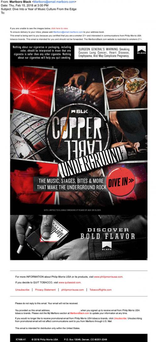 Email from Marlboro Black in February 2018 promoting the Copper Label underground music feature on the brand website, with a link to check out the music scene culture covered in the past year.