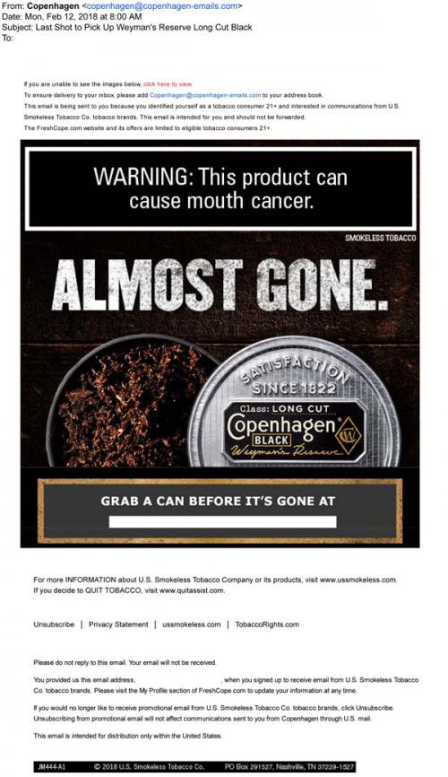 Email from Copenhagen in February 2018 reminding the recipient that the limited edition Weyman's Reserve product availability is ending soon, and gives a retail location to purchase it at.