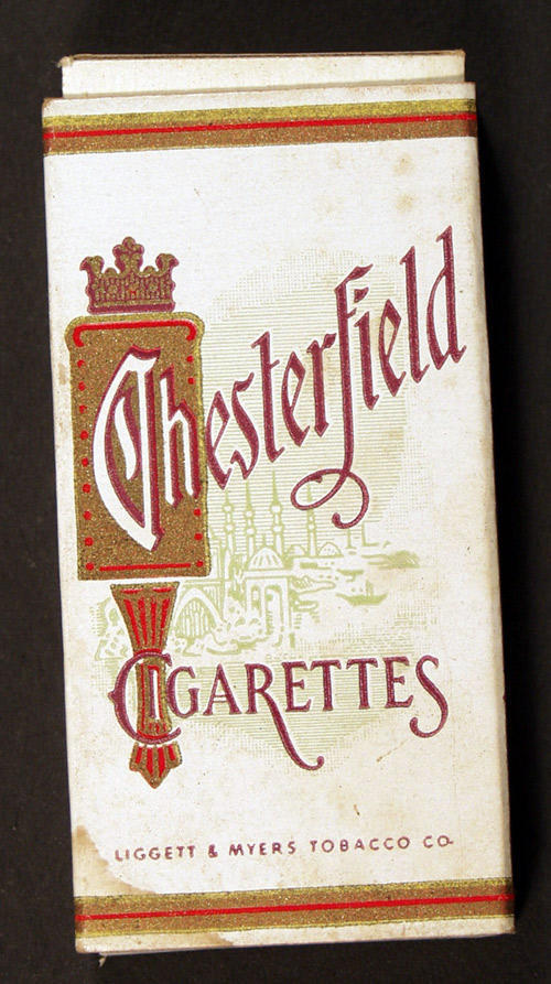 Chesterfield 4 cigarette pack from Liggett and Myers. "No adverse effects to their nose, throat or sinuses from smoking Chesterfields."