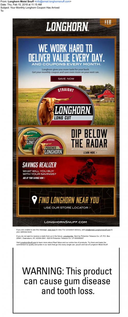 Email from Longhorn in February 2018 linking to claim coupons through the brand website, learn more about their products, use a savings calculator, and find a nearby retail location.
