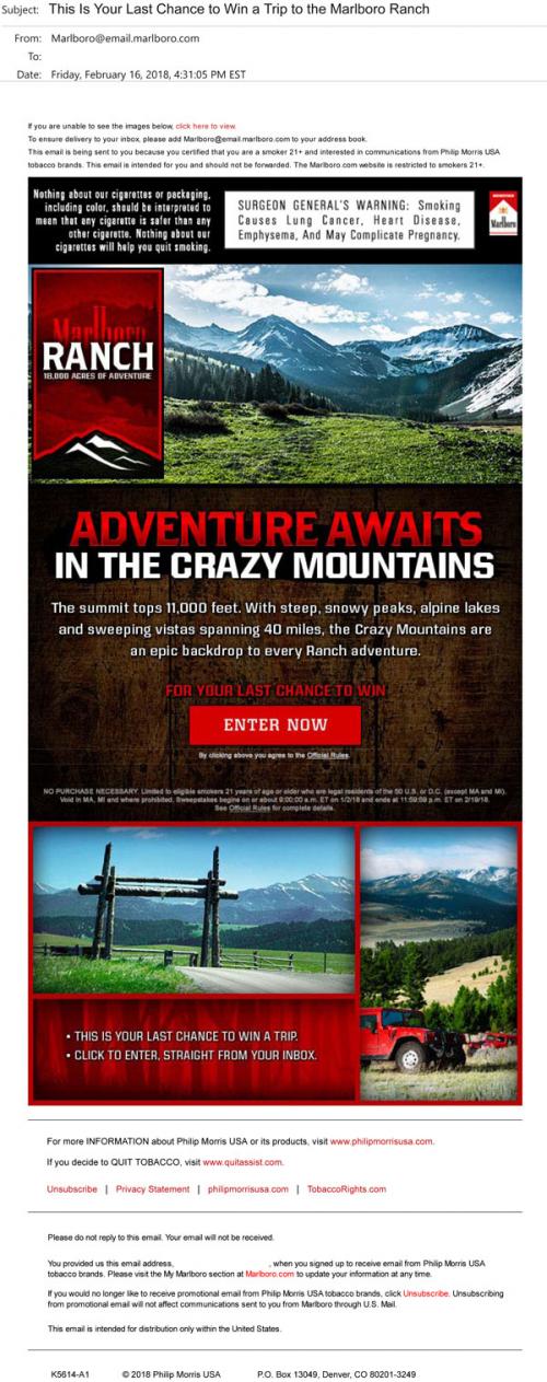 Email from Marlboro in February 2018 announcing the final chance to win a trip to the Marlboro Ranch; includes a link to enter directly from the email.