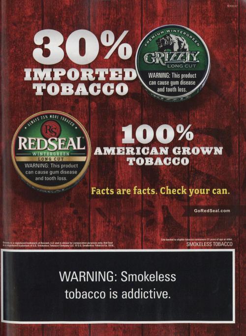Magazine ad from Red Seal comparing the brand's American-grown tobacco content to competitor Grizzly. Promotes the brand website. Text: "Facts are facts. Check your can."