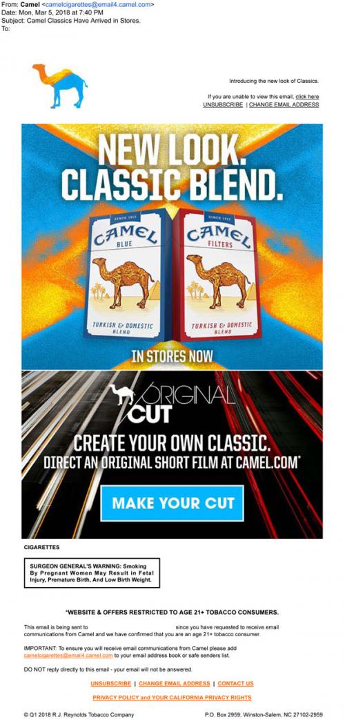 Email from Camel in March 2018 announcing the new classic pack designs now available in stores. Also promotes the creative project Original Cut, the ability to direct a short film on the brand website.