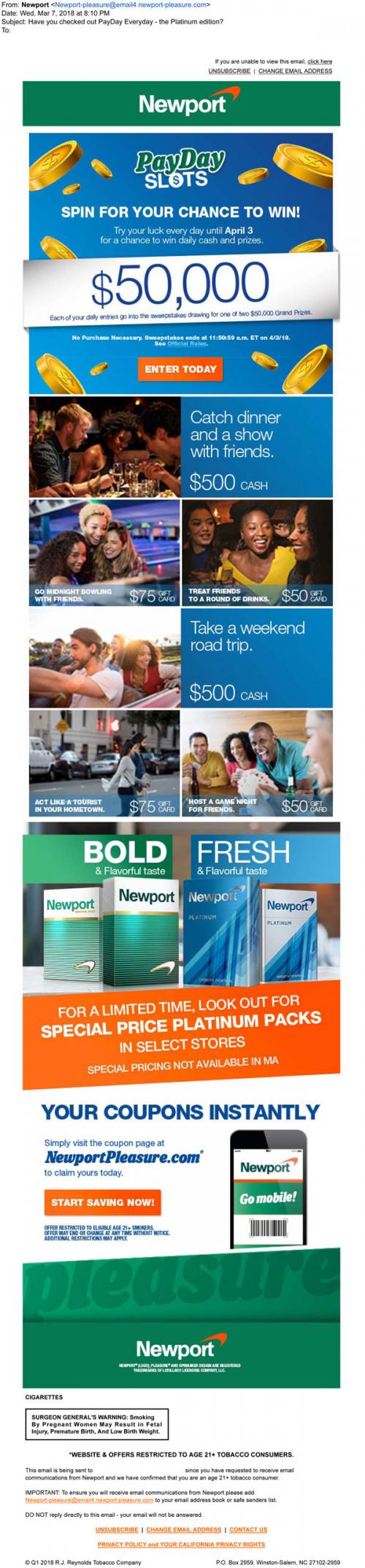Email from Newport in March 2018 promoting the PayDay Slots sweepstakes, with a link to the brand website to enter. Mentions a special price discount in select retail stores for their Platinum products, and advertises the availability of instant mobile coupons.