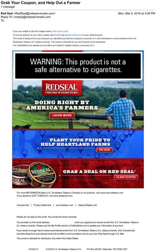 Email from Red Seal in March 2018 linking to check out how the brand helps American farmers, and to interact on the brand website by pinning your location to the customer map. Also links to claim a coupon.