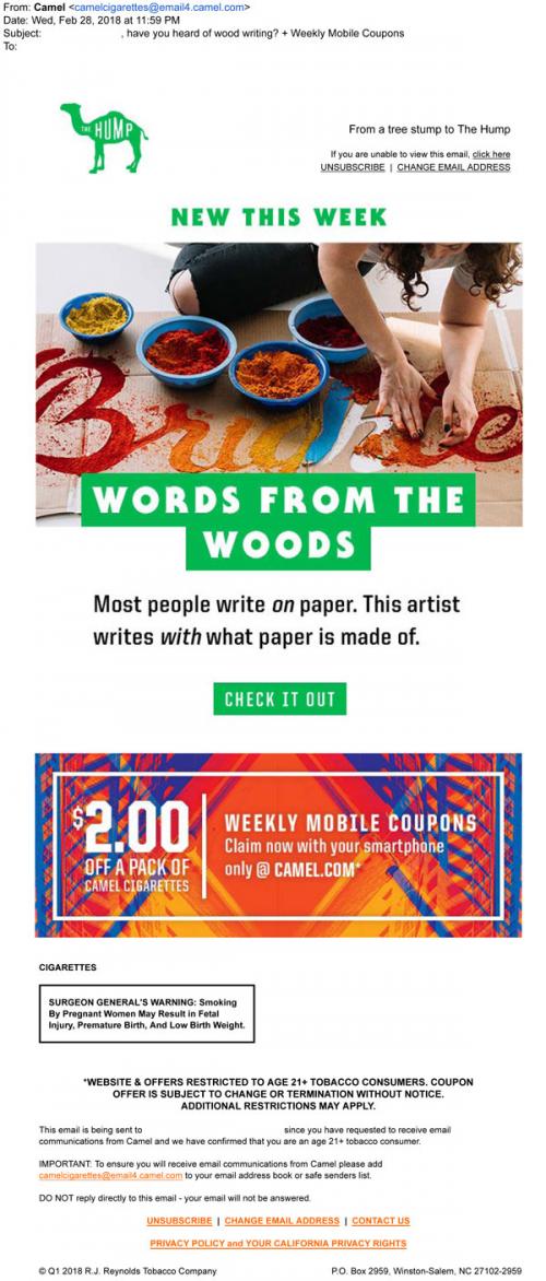 Camel email in February 2018 promoting the weekly mobile coupons available as well as a new featured article on The Hump.