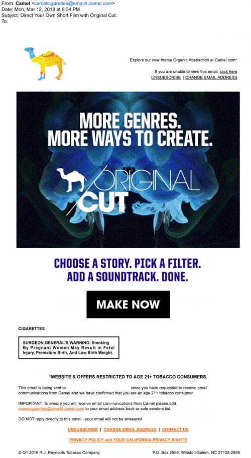 Email from Camel in March 2018 promoting the Original Cut project, where visitors to the brand website can create mini films.