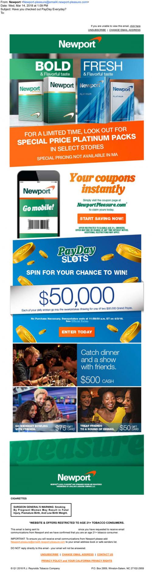 Newport email from March 2018 announcing limited time discount pricing in retail stores on their Platinum menthol packs. Also promotes mobile coupons and the PayDay Slots sweepstakes that can be entered on the brand website. Includes images of happy people celebrating with their possible winnings.