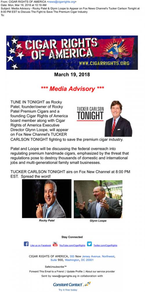 Cigar Rights of America email from March 2018 announcing a media appearance of two board members on Fox News to discuss "federal overreach into regulating premium handmade cigars."