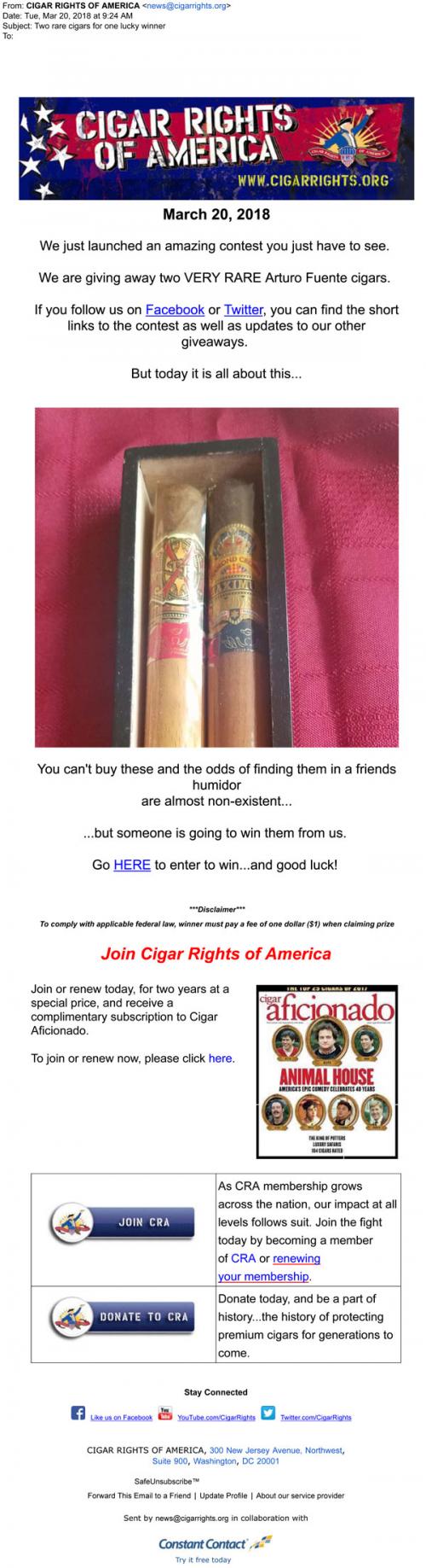 Email from Cigar Rights of America in March 2018 providing links to enter online and win some rare cigars through their social media platforms. Also solicits for memberships and donations.