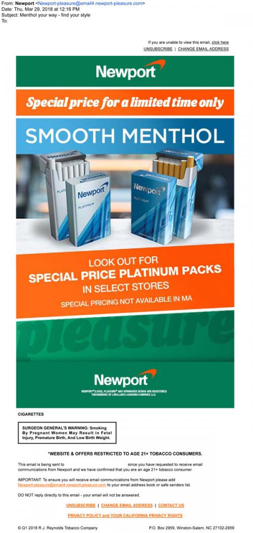 Email from Newport in March 2018 promoting a limited time sale on Platinum menthol products in select stores.