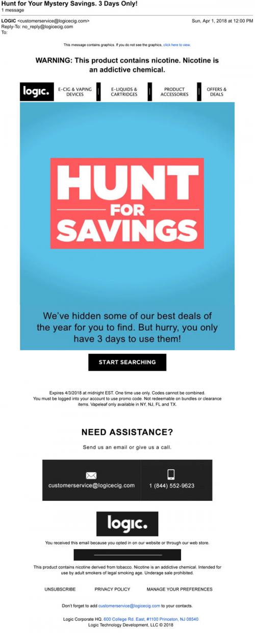Email from Logic in April 2018 announcing a promotional sale on certain items through the brand website store that must be discovered by product. Includes an animated GIF of various products "peeking" out of hiding.