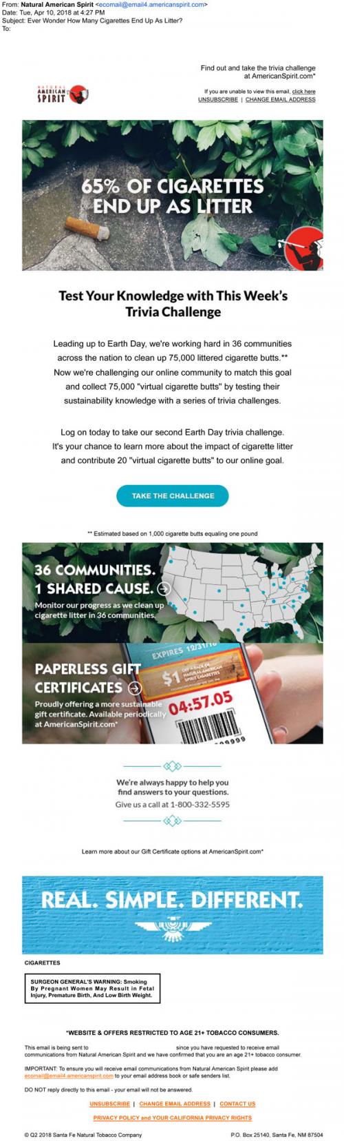 American Spirit email from April 2018 introducing the current weekly trivia challenge, in a project for Earth Day trying to match community cigarette cleanup to virtual cigarette butts collected for answering questions correctly. Links to learn more about the cleanup project and see a map of the progress, as well as claim mobile coupons, on the brand website.