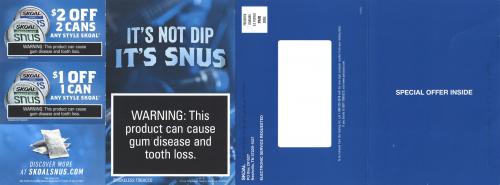 Direct mail received from Skoal in April 2018 that promotes their snus products, describing their pouch technology and claiming the products are "made for smokers." Includes coupons. The products are displayed on an amp with a guitarist in the background.
