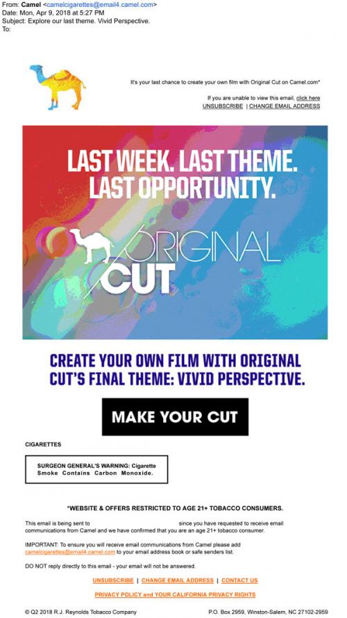 Camel email in April 2018 promoting the last week of the Original Cut project, where visitors to the brand website could create an original video.