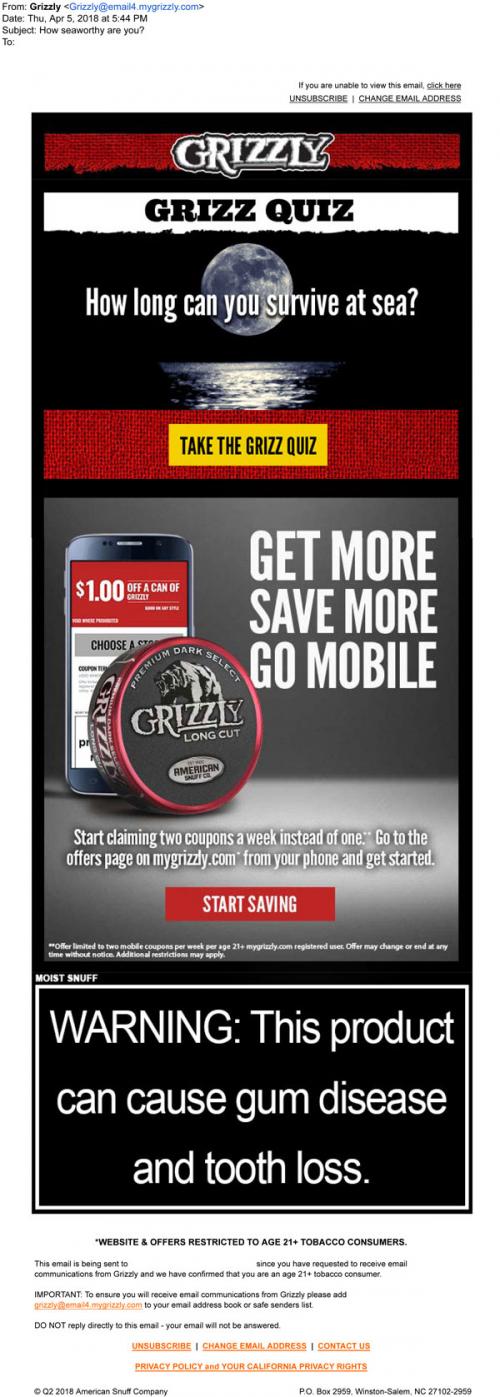 Email from Grizzly in April 2018 linking to a new Grizz Quiz and promoting weekly mobile coupons.