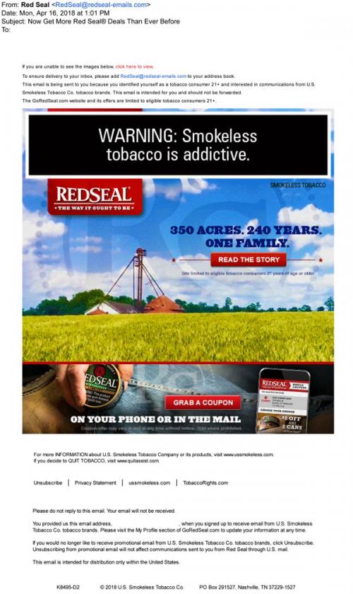 Email from Red Seal in April 2018 linking to the brand website to read a farm story feature and to claim coupons via direct mail or mobile phone.