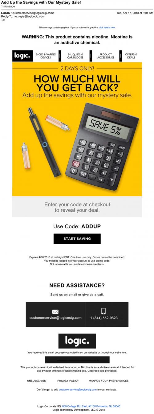 Email from Logic in April 2018 describing a mystery deal through the brand website that requires the promo code to reveal the total savings earned. Links to the online store to purchase during a limited time.