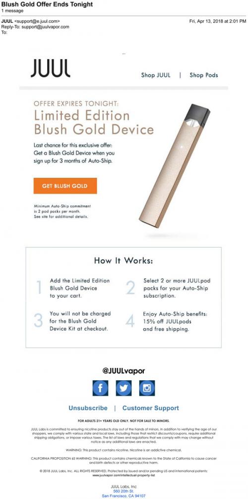 Email from JUUL in April 2018 that announces the last chance to sign up for their auto-ship ordering program through the brand website in order to get a free, limited edition blush gold device. Describes the steps needed to claim the offer.