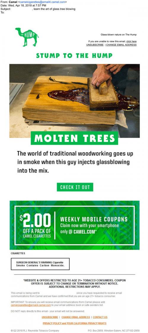 Email from Camel in April 2018 linking to a new article on The Hump feature, as well as new weekly mobile coupons to claim.