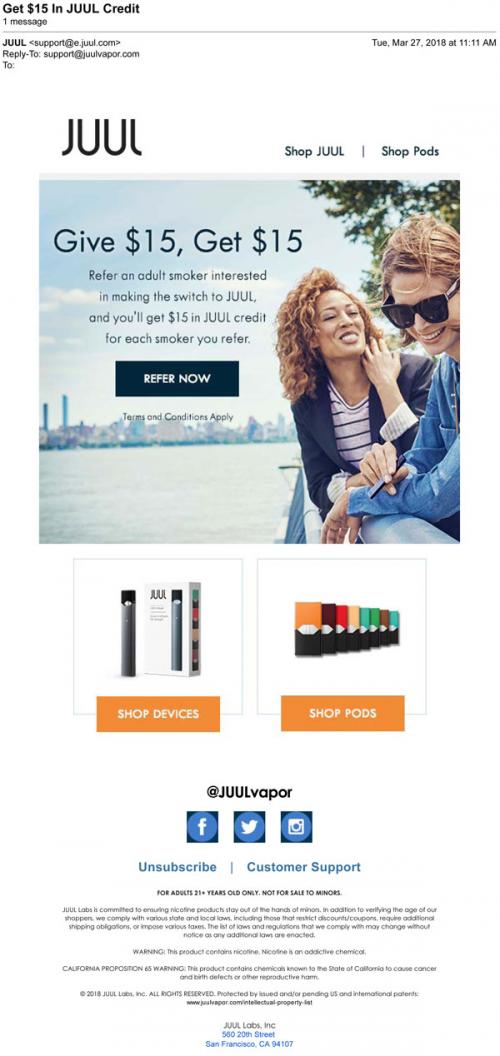 JUUL email in March 2018 mentioning the "refer a smoker" promotion, where customers who refer an adult smoker to make a purchase get 15$ in store credit. Includes links to shop devices and pods.