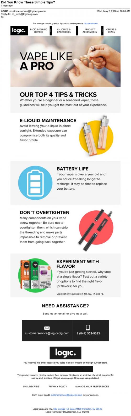 Email from Logic in May 2018 with some tips describing how to "vape like a pro," from device maintenance to trying different flavors.