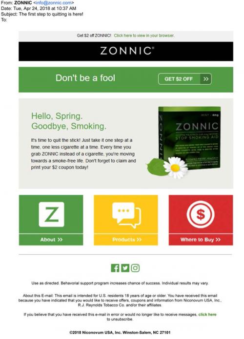 Email from Zonnic in April 2018 greeting Spring and linking to claim a coupon through the brand website.