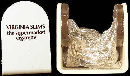Virginia Slims the supermarket cigarette: ten plastic container holding paper clips with brown text on sides.