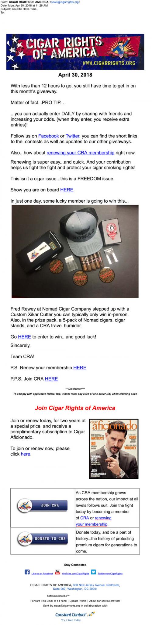 Email from the Cigar Rights of America in April 2018 promoting a giveaway through social media of a prize pack including cigars and related paraphernalia. Also solicits memberships and donations to the organization.