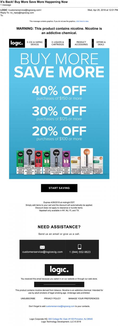 Logic email in April 2018 promoting a sale through the online store, where larger purchases have greater discounts. Shows a lineup of some available products.