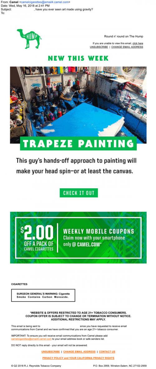 Camel email from May 2018 linking to check out the newest featured article on The Hump; also links to claim weekly mobile coupons.