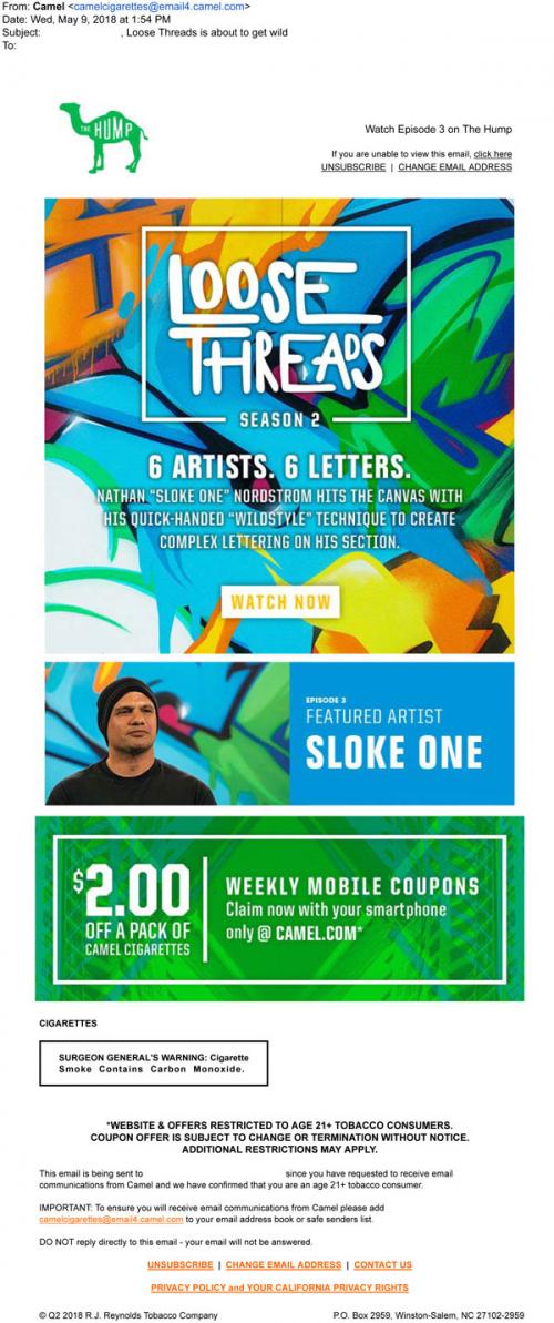Email from Camel in May 2018 promoting the next episode of the Loose Threads video series, and the featured artist. Also links to claim weekly mobile coupons.