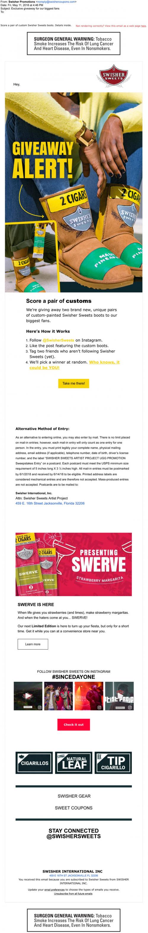 Swisher email from May 2018 alerting the recipient to a giveaway through the brand's social media platform on Instagram. Also introduces a new limited edition flavored product, and links to get gear and coupons from the brand website.