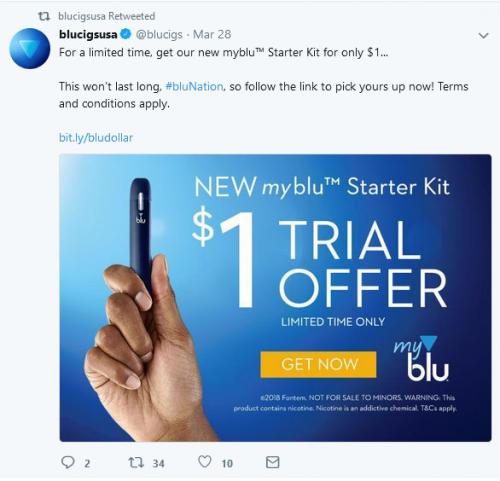 Twitter post from blu introducing a limited time offer of 1$ for their new myblu starter kits. Provides a link to the brand website to purchase.
