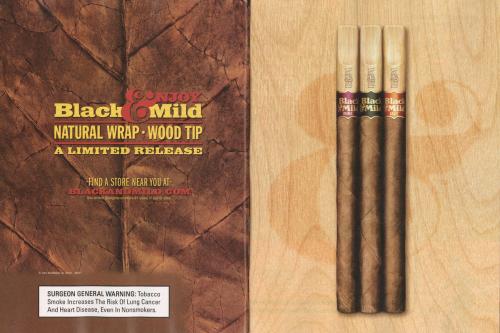 2-page magazine ad for Black & Mild announcing a limited release of natural wrap wood tip cigars. Directs the viewer to find a store on the brand website and shows their wine, black, and jazz products.