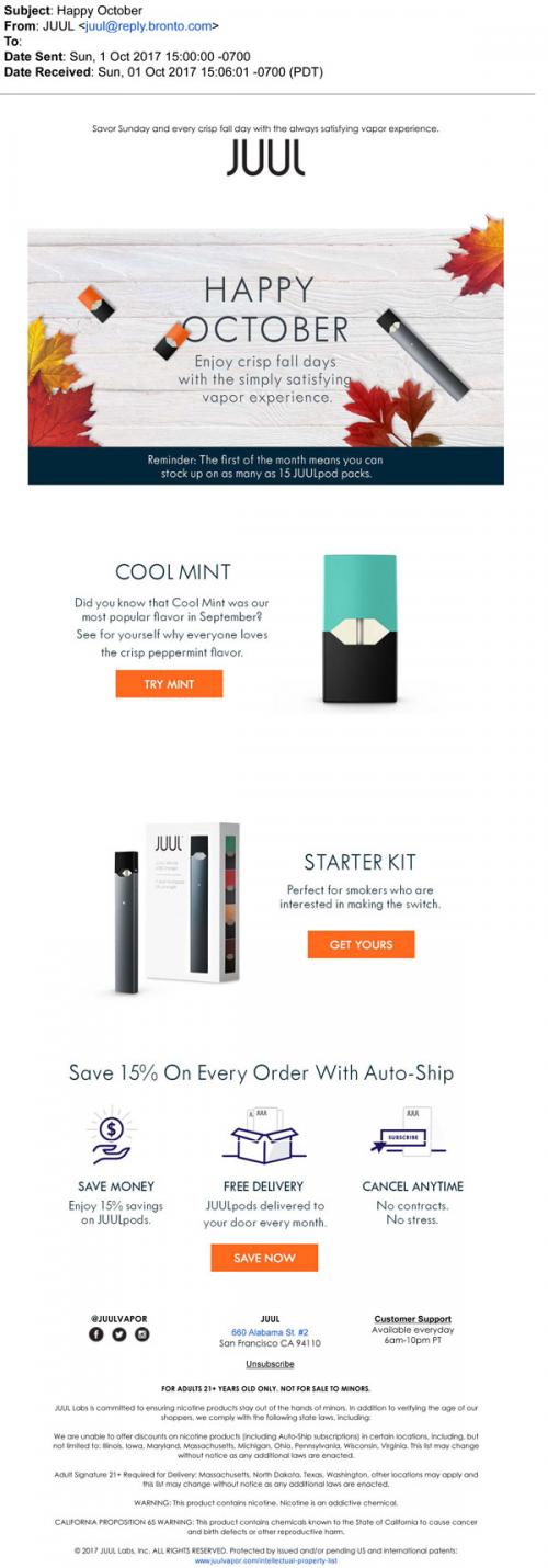 Email from JUUL in October 2017 promoting their products for fall, especially their 'cool mint' flavor. Also promotes the starter kit and the auto-ship program.